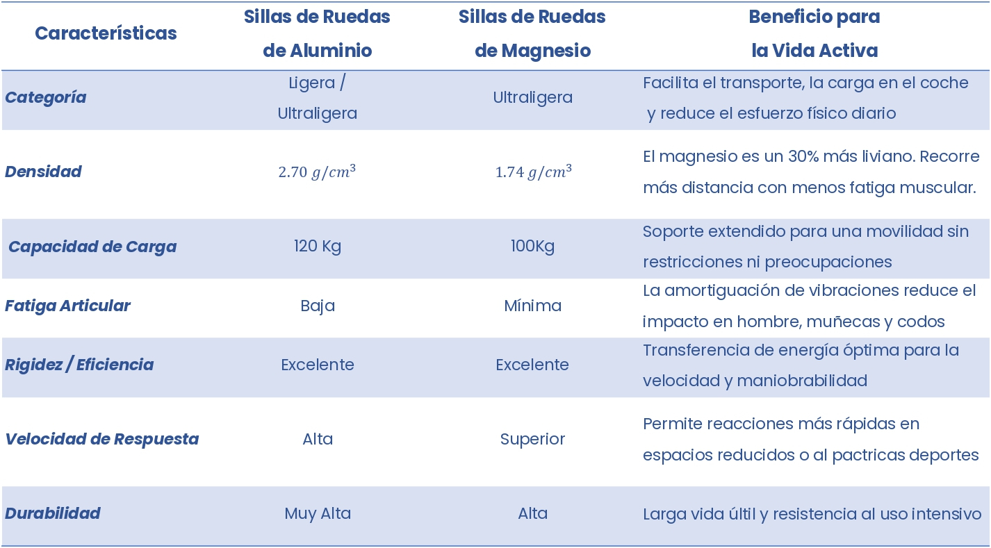 Sin embargo, la ligereza del magnesio aporta una velocidad de respuesta superior, permitiendo reacciones más rápidas y mayor destreza, algo esencial en espacios reducidos y en el deporte adaptado.